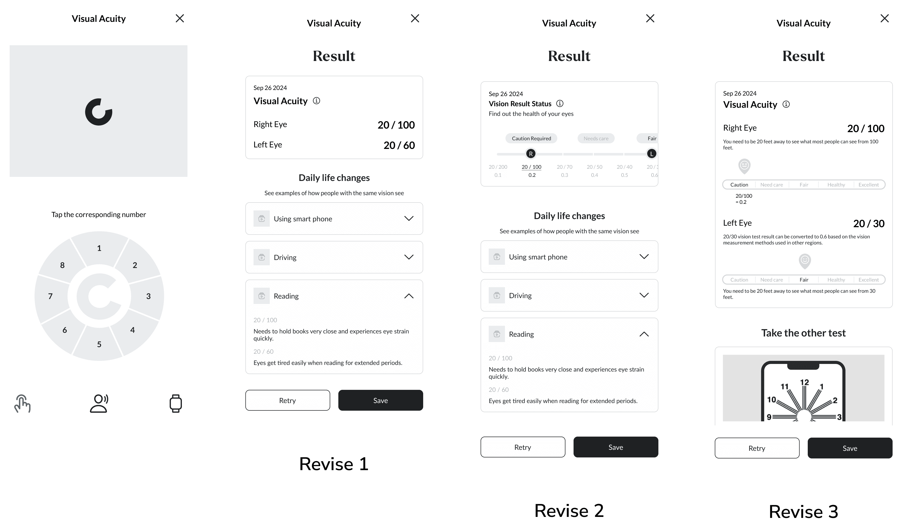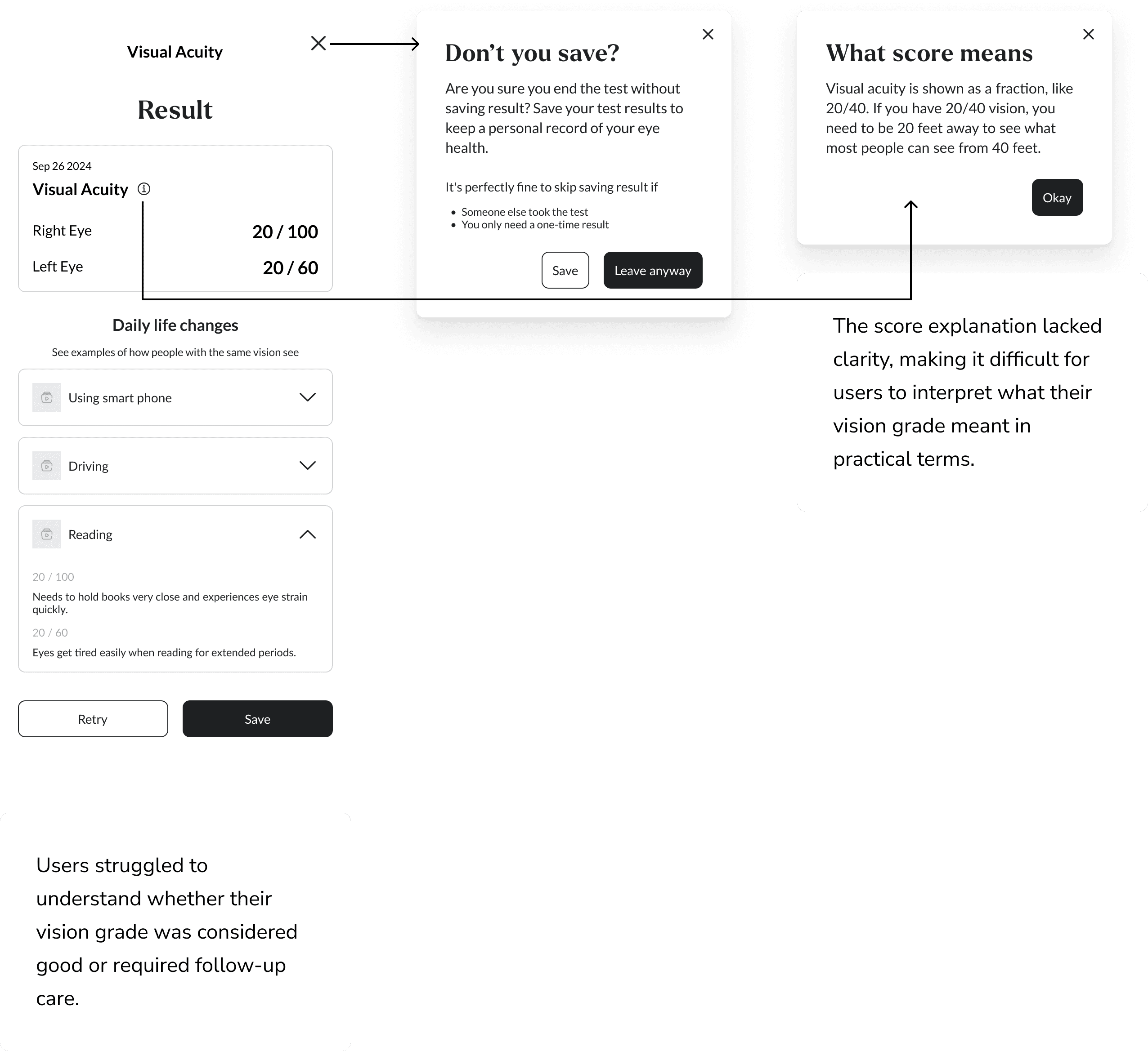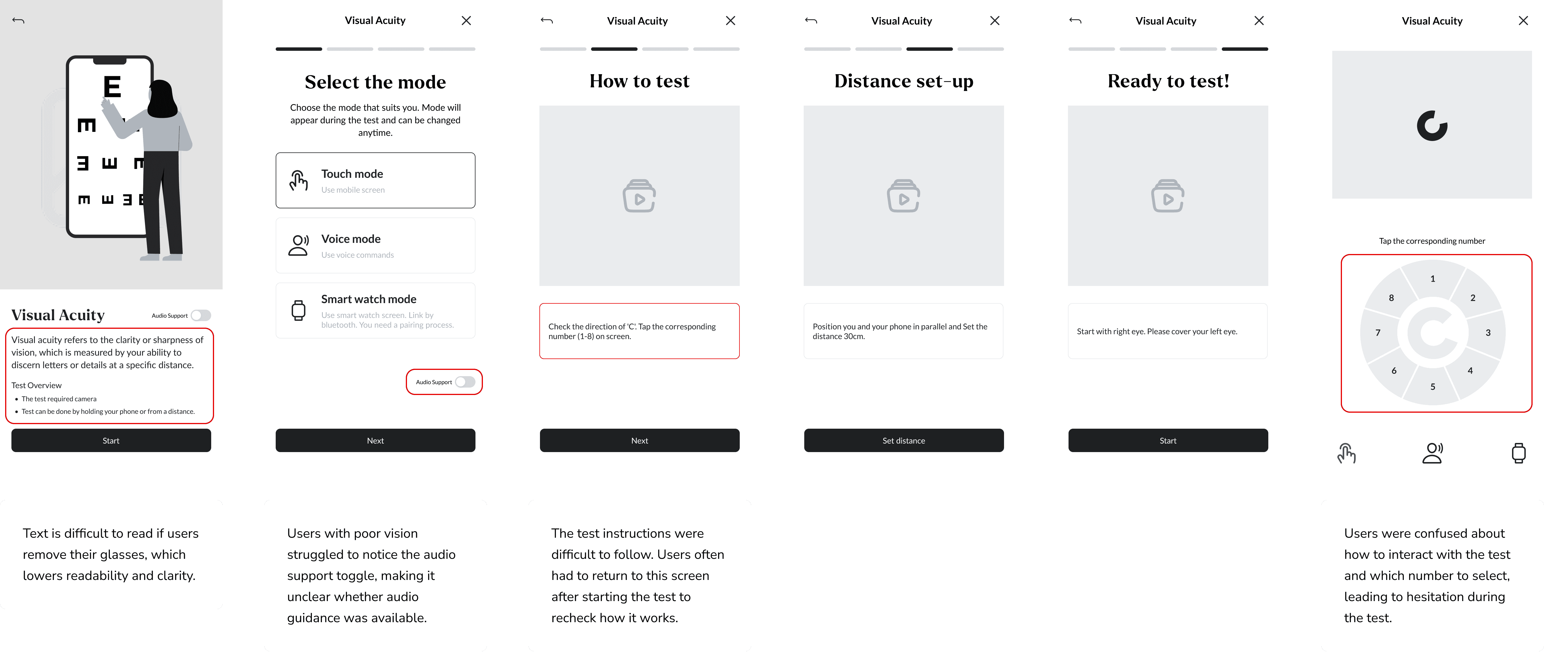 Usability testing revealed that users struggled to understand and complete the vision test due to unclear information, low readability, and limited accessibility. These insights led us to refine the design with a focus on improving clarity and supporting a more intuitive, user-centered experience.