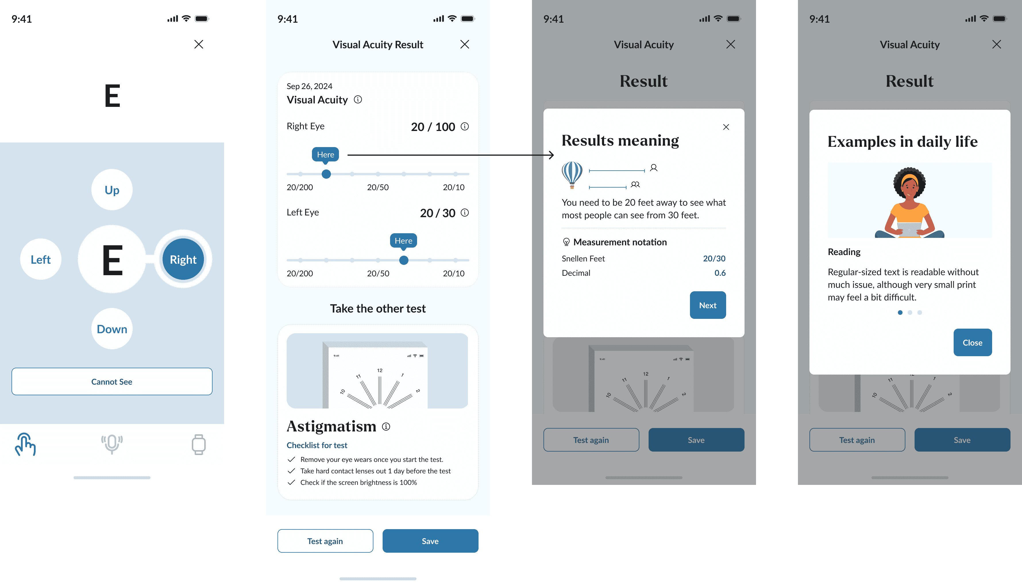 The results screen was improved with a clear visual bar chart, grade tooltips, and real-life examples to help users better understand and act on their vision results.