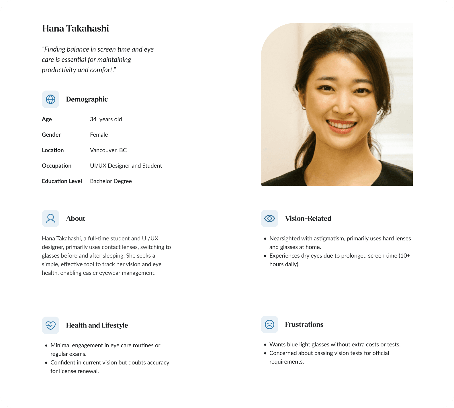 One of the primary users for the vision test feature is Hana Takahashi. She experiences eye strain due to dry eyes and prolonged screen time at work. She wants a simple way to regularly check whether her vision is stable or worsening.