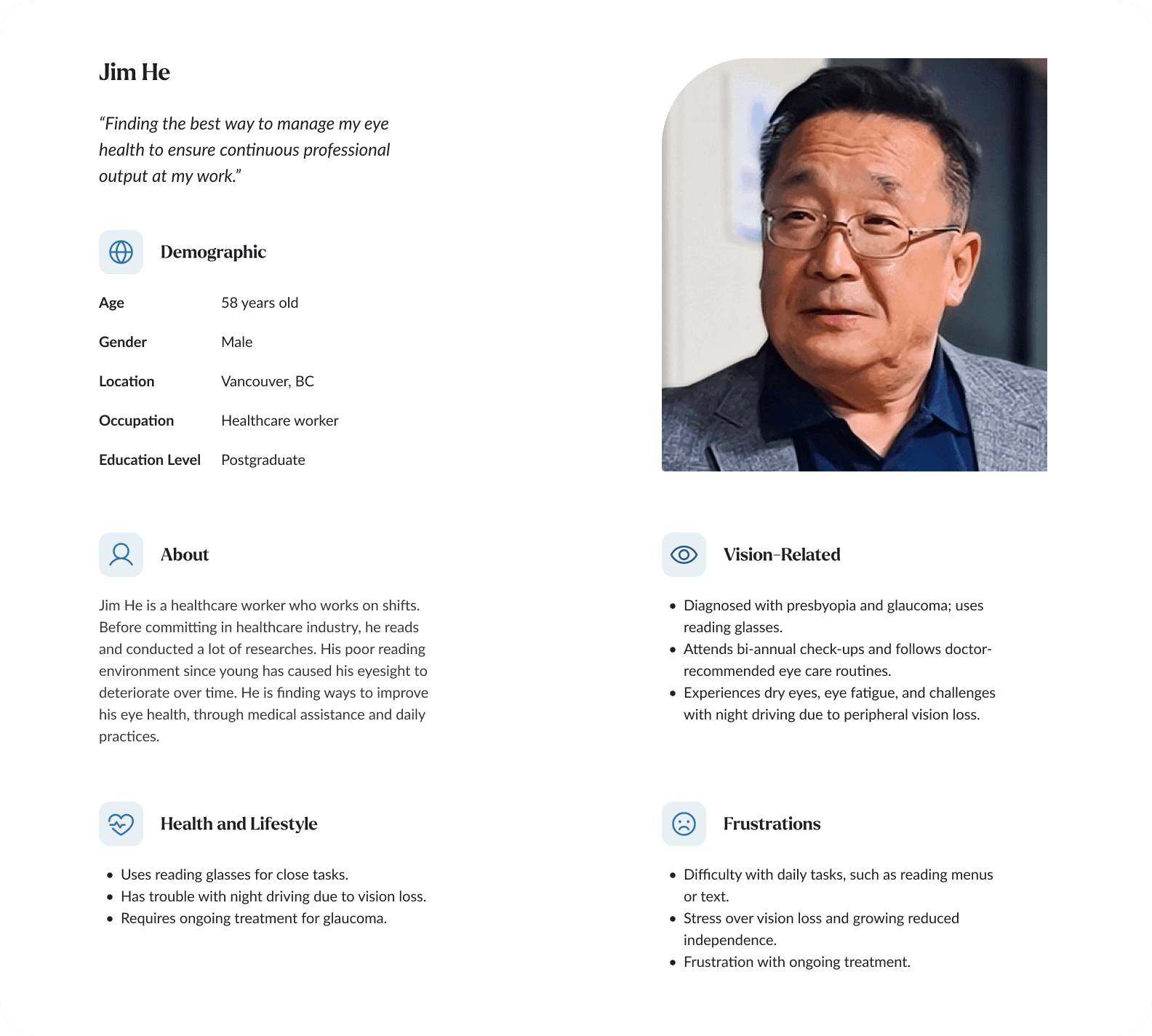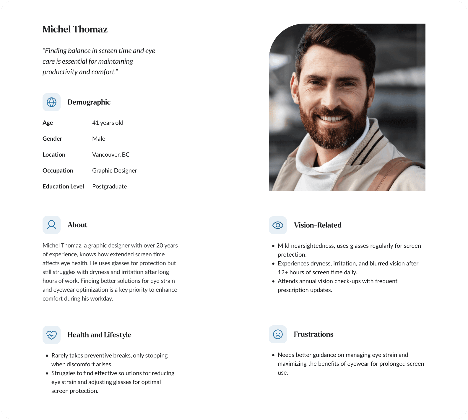 To better understand our target users' goals and pain points, we developed three personas that reflect the different behaviors and eye health challenges observed during research.